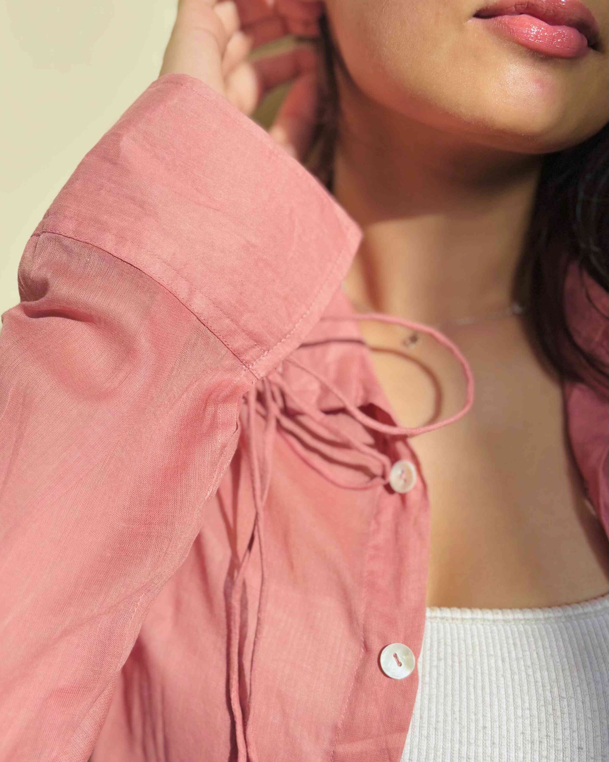 Mul shirt with shell buttons and tie ups on cuff with pearl detail