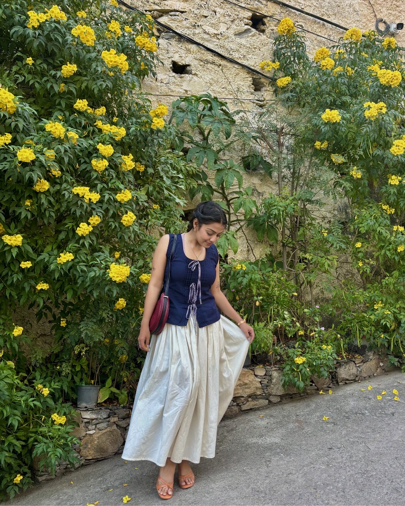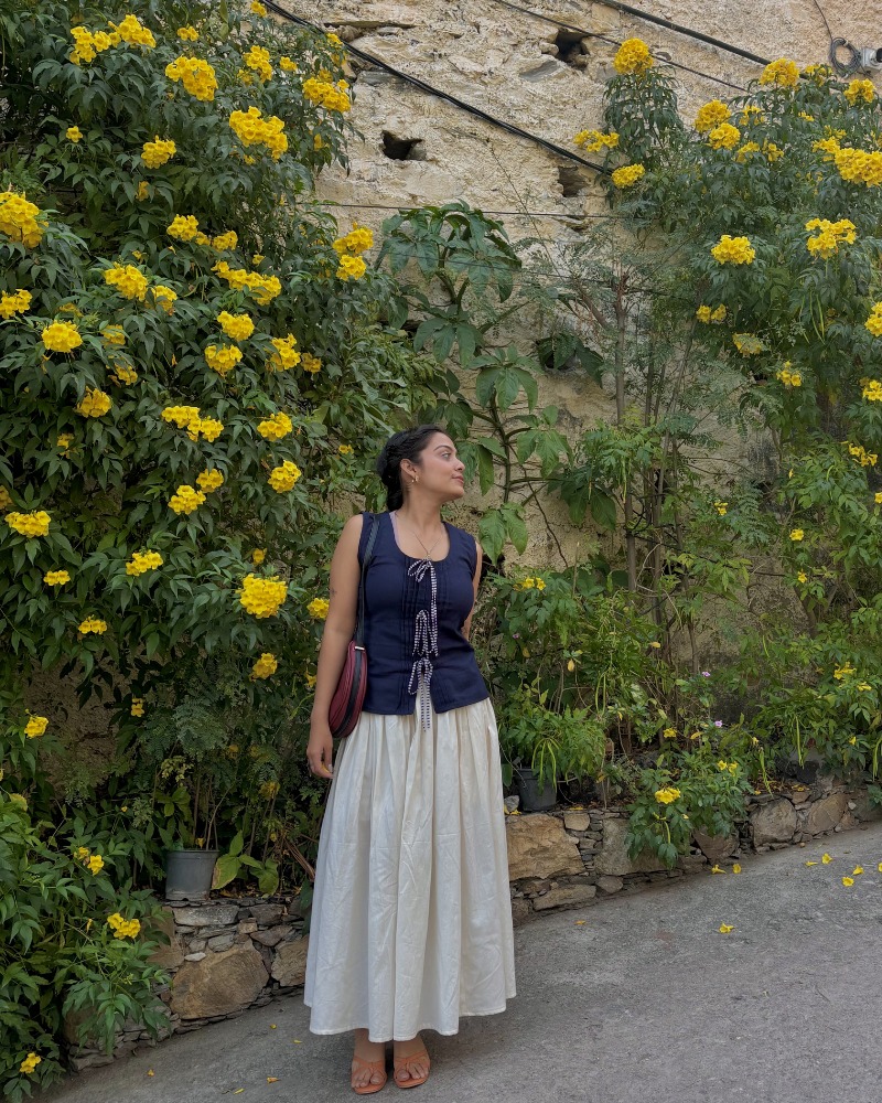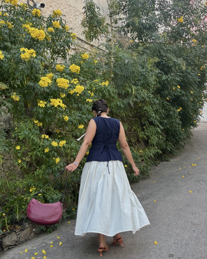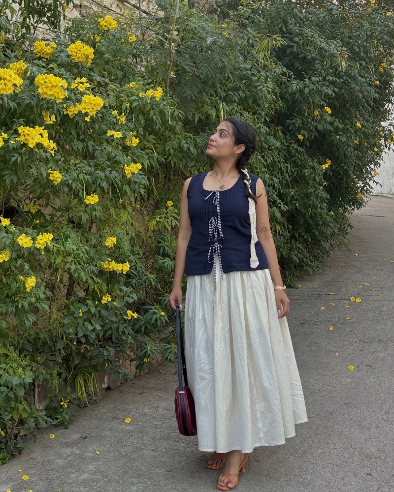 Navy blue top with striped tie ups and stitched front opening along with corset tie up back paired with flared elasticated skirt with lining