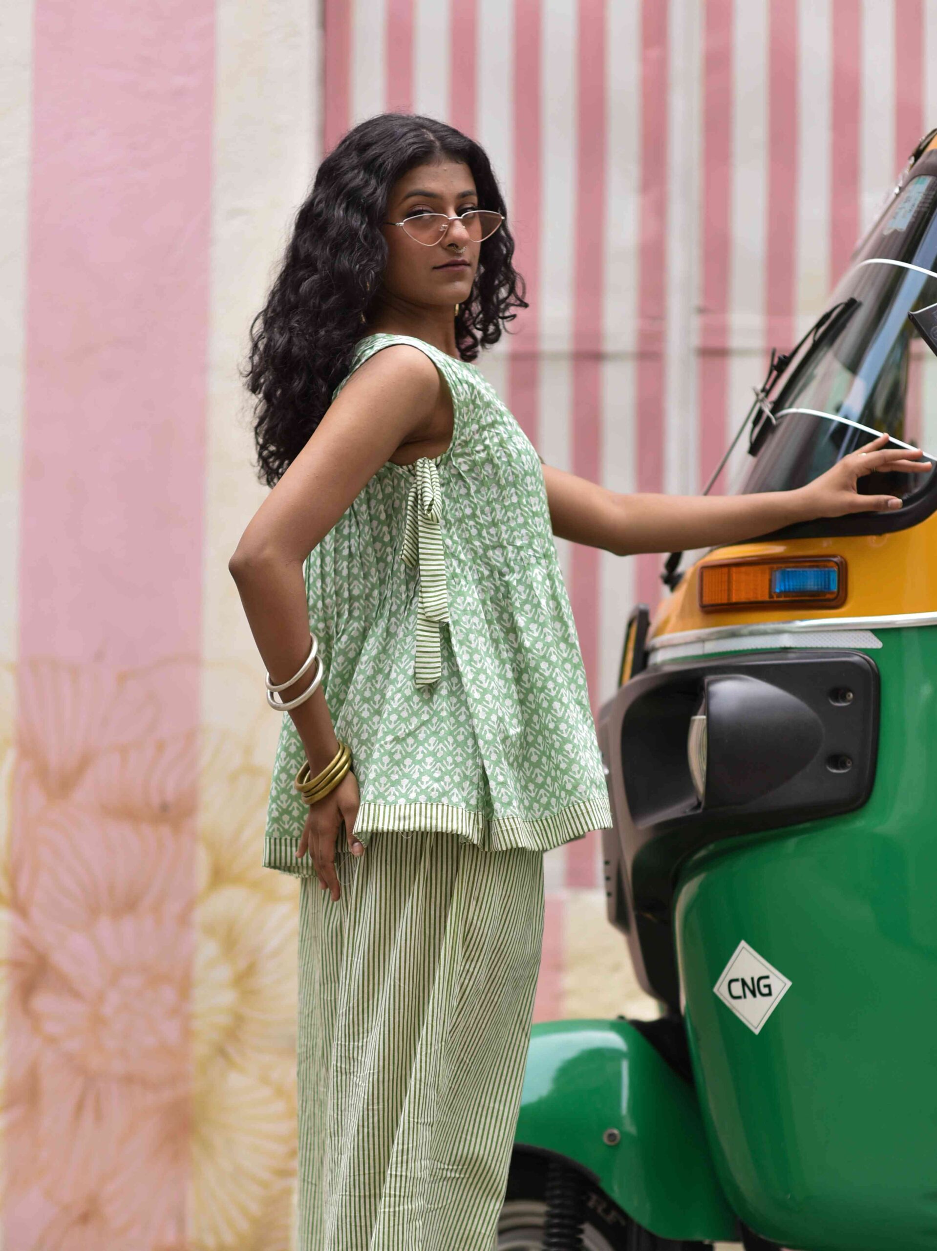 Tucks all over the top with combination fabric patch at the back ,tie ups on the sides