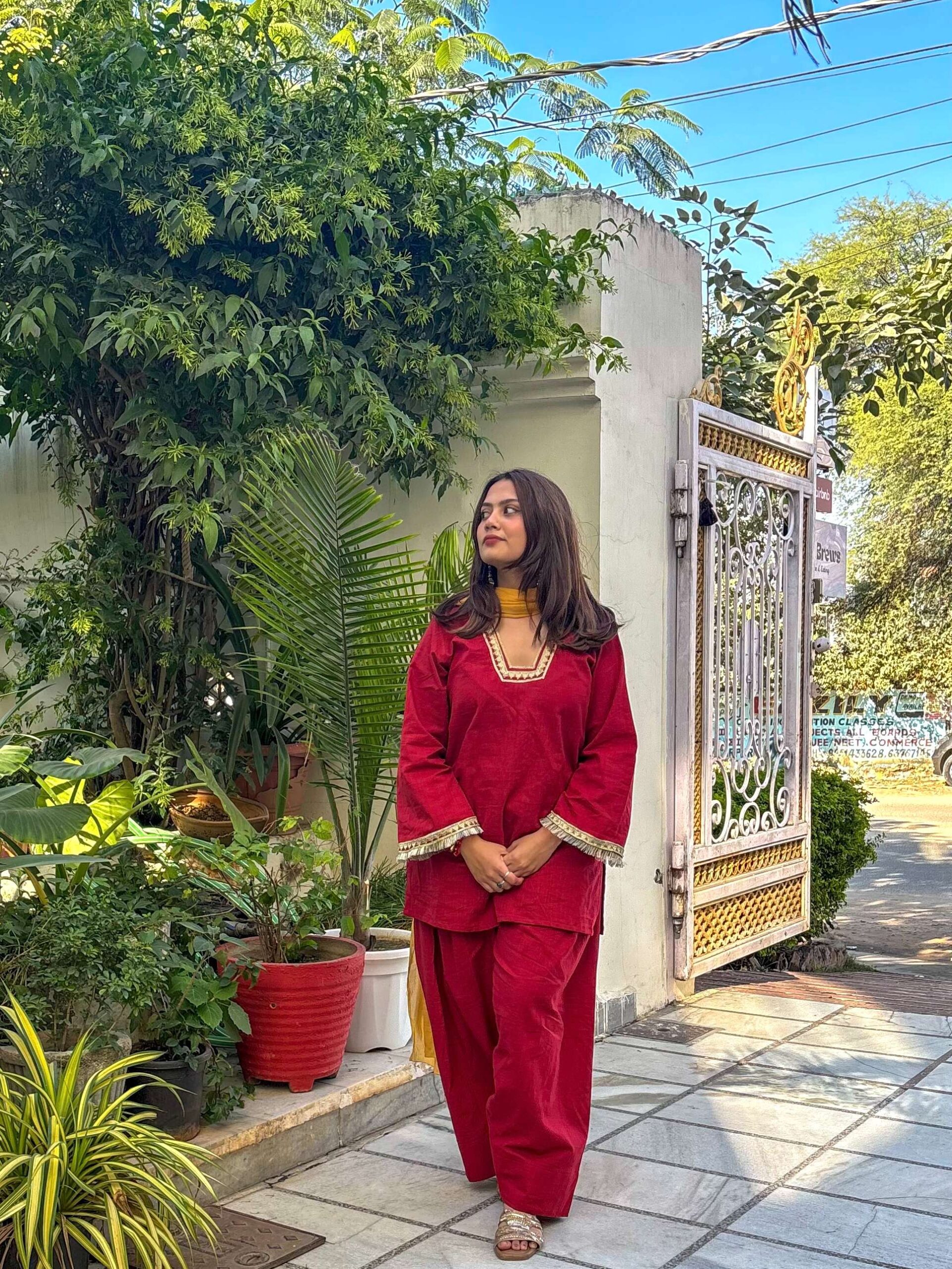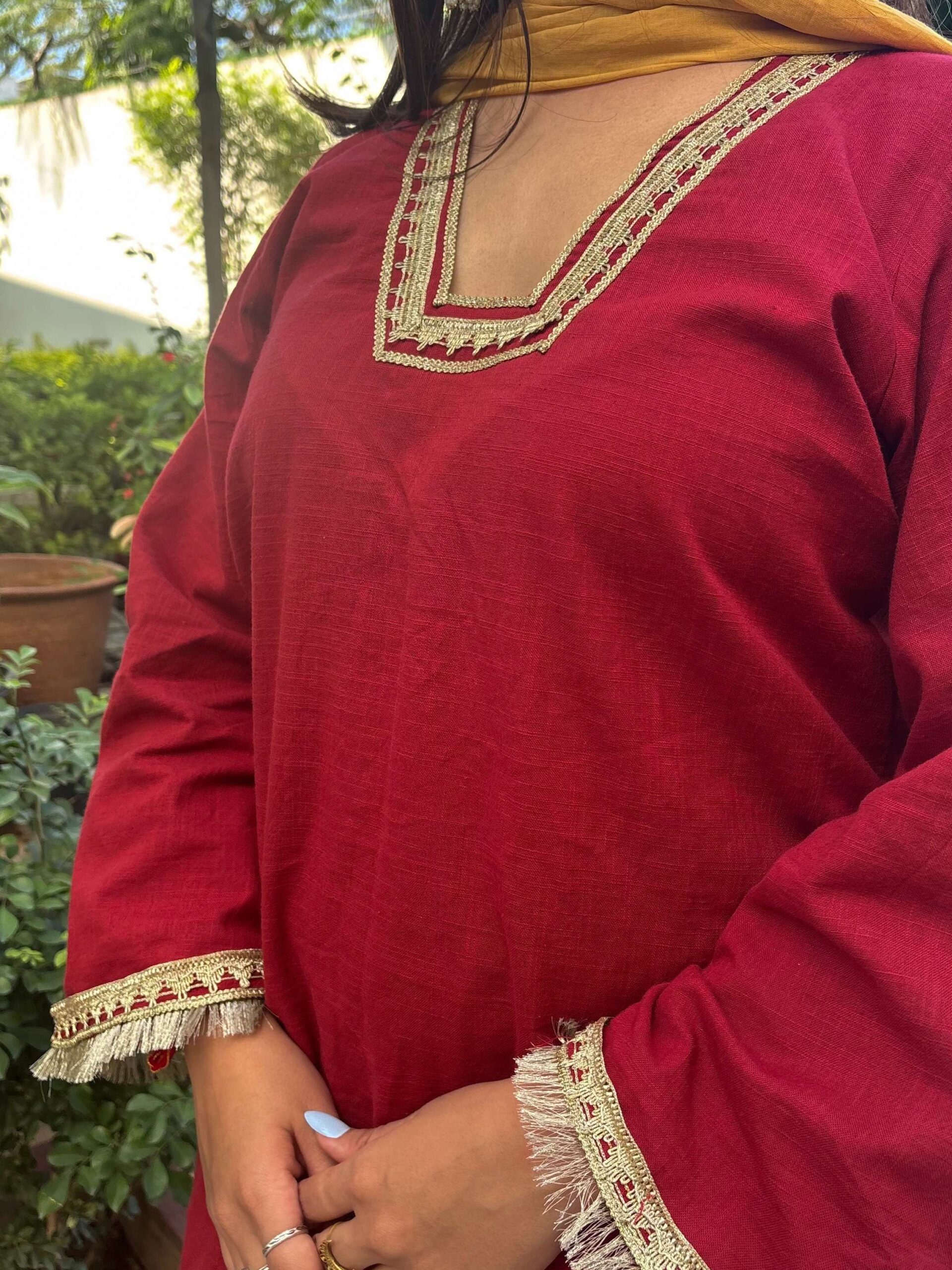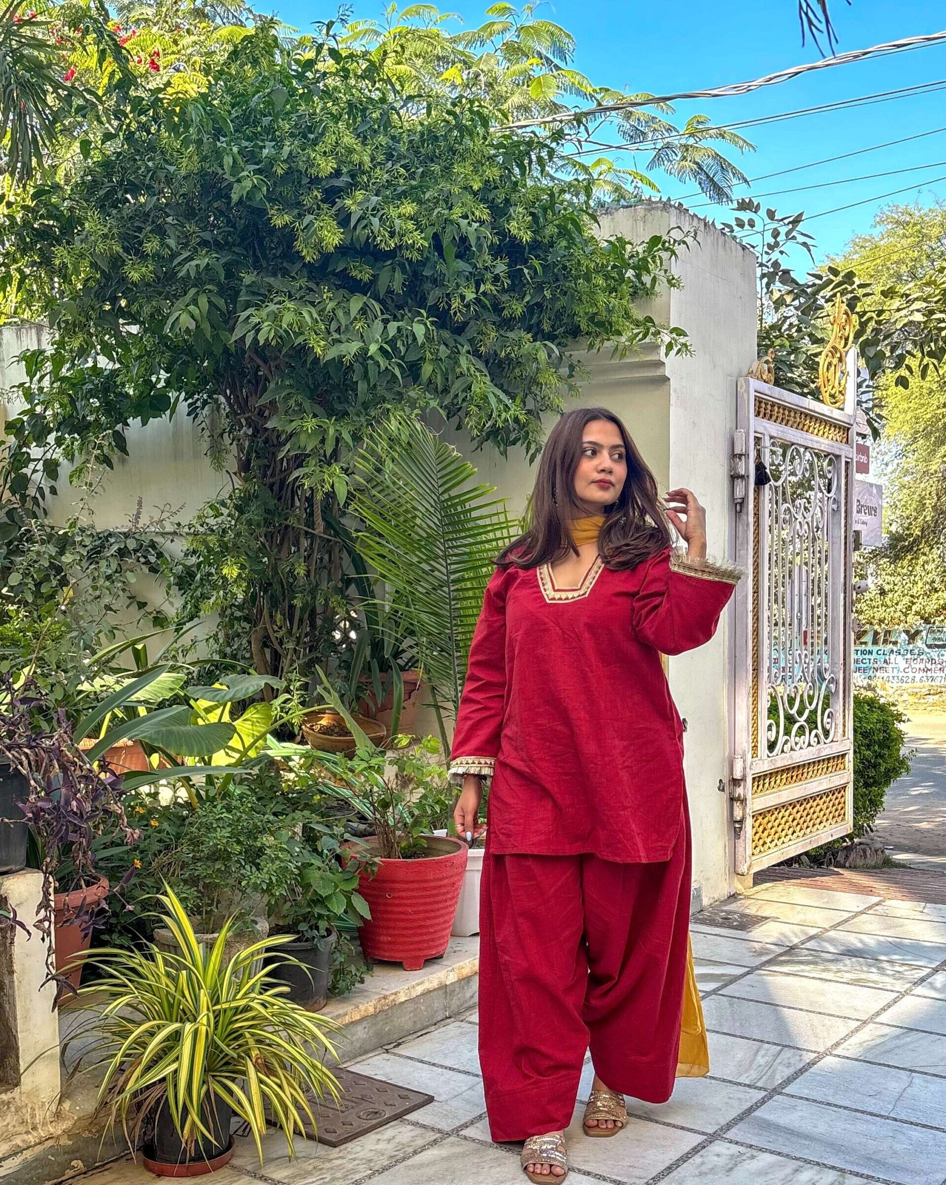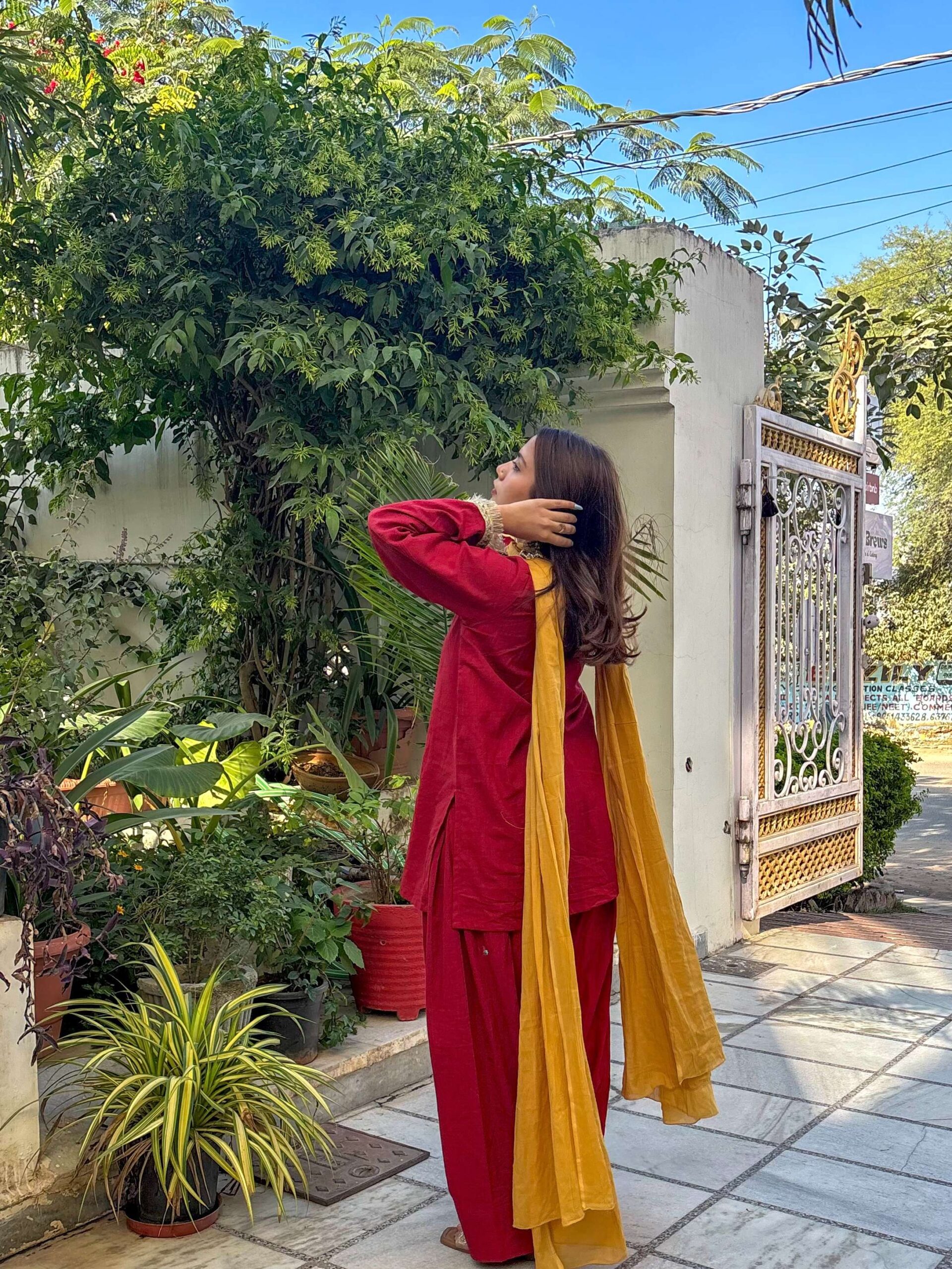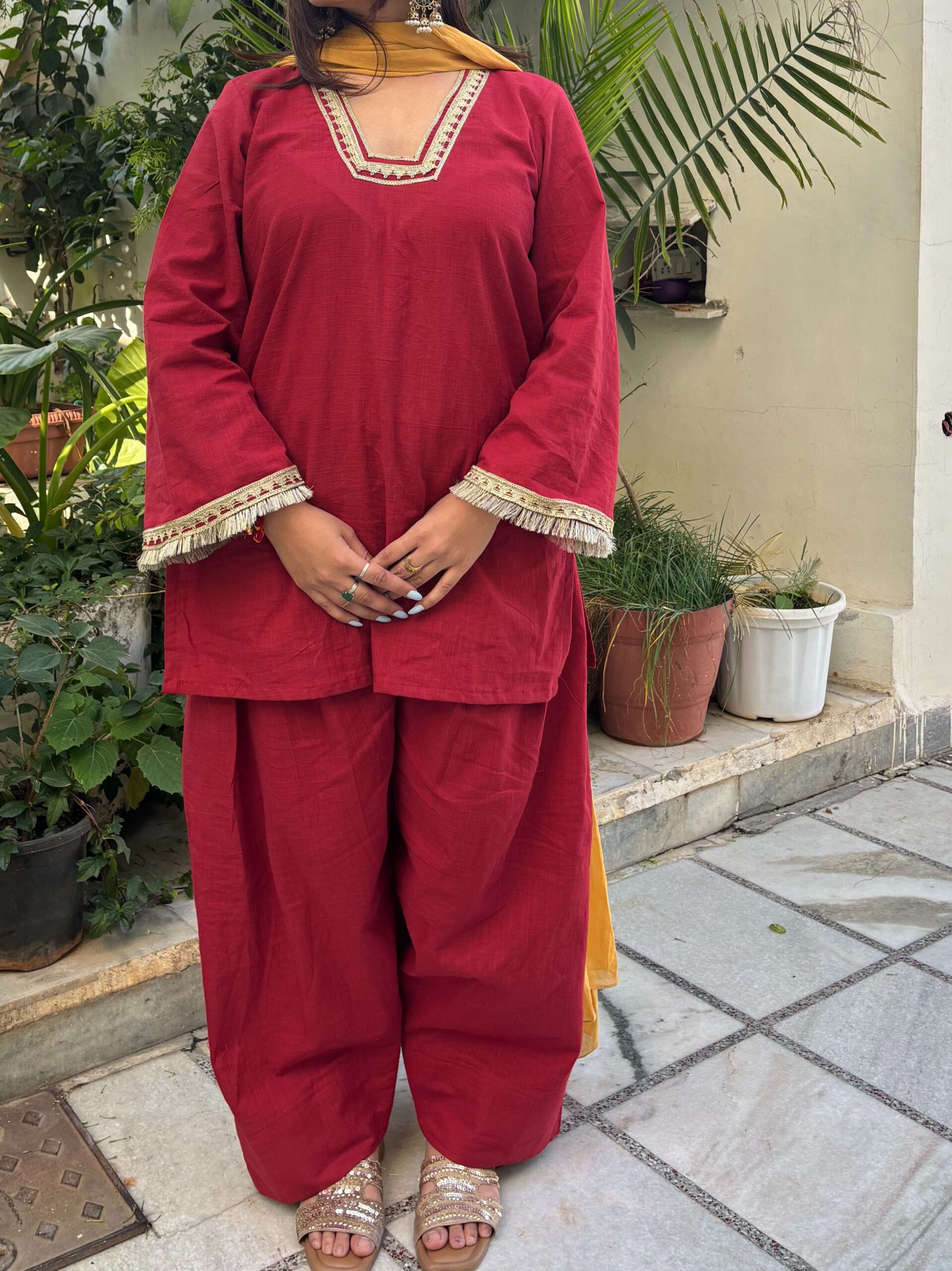Farsi suit set with bell sleeves kurta ,Farsi salwar,mul contrast mustard dupatta